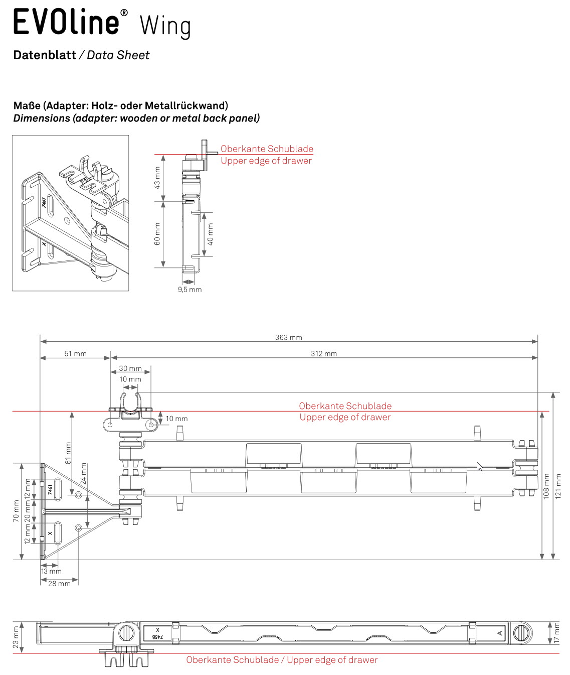 The horizontal and vertical cable management system for all movable and extendable furniture parts. EVOline Wing is the solution for in-drawer-fitted sockets and charging systems.Wing guides cables behind the drawer to save space without bending or